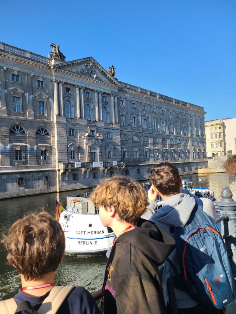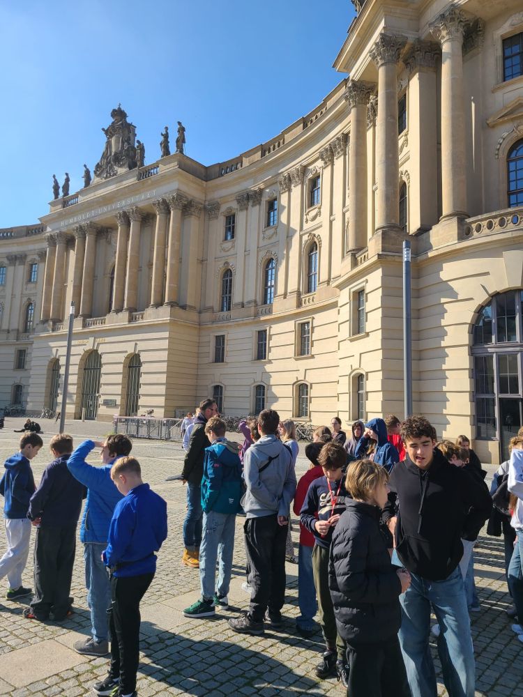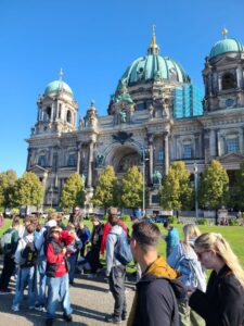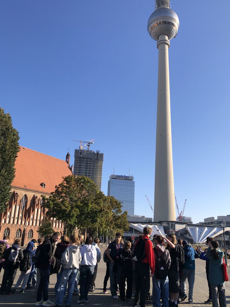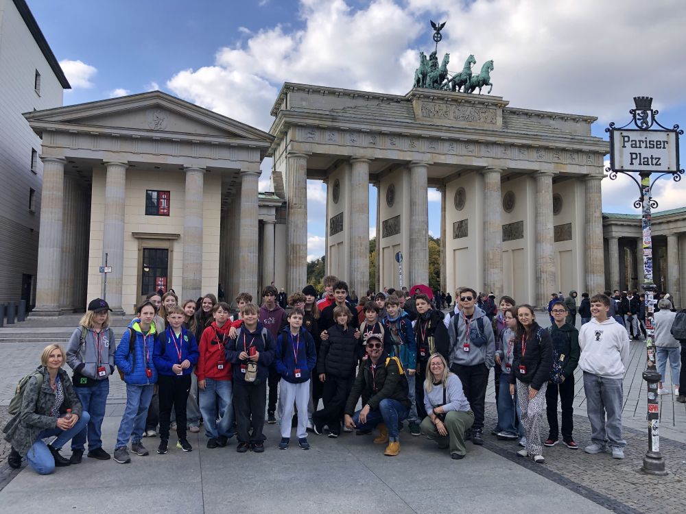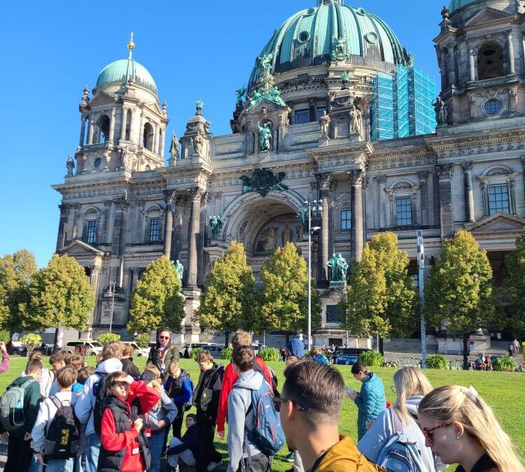 W dniach 01–03 października 2025 r. uczniowie naszej szkoły pod opieką nauczycieli zwiedzili Berlin oraz Poczdam. Po przyjeździe do stolicy Niemiec rozpoczęliśmy zwiedzanie od Muzeum Historii Naturalnej, pierwszego państwowego muzeum na świecie. W swoich zbiorach muzeum posiada kolekcję ponad 30 milionów eksponatów zoologicznych, paleontologicznych, mineralogicznych i innych. Jedną z atrakcji było spotkanie z największym na świecie szkieletem dinozaura, kolosalnym brachiozaurem o wysokości 13,27 m. Następnie przeszliśmy na Alexanderplatz i wjechaliśmy na Wieżę Telewizyjną mierzącą 368 m, z której podziwialiśmy wspaniałą panoramę miasta. Na naszej drodze znalazły się najważniejsze zabytki Berlina, m.in. Berliner Dom – katedra z grobami Hohenzollernów, zbudowana w latach 1894–1905 w stylu neobarokowym, będąca jedną z najważniejszych i najpiękniejszych świątyń w Niemczech. Nie mogło zabraknąć jednego z najbardziej rozpoznawalnych symboli Niemiec i samego miasta Bramy Brandenburskiej wzniesionej w latach 1788–1791 w stylu klasycystycznym. Dzisiaj Brama Brandenburska stanowi symbol pokoju i wolności. Spacer jedną z najsłynniejszych ulic Berlina tj. aleją Unter den Linden umożliwił nam podziwianie licznych zabytkowych budowli, do których należały m.in.. Uniwersytet Humboldta, Opera Państwowa, Katedra św. Jadwigi oraz dawne pałace arystokratyczne. Na trasie naszej wycieczki znalazł się również Reichstag, siedziba niemieckiego Bundestagu, jeden z najważniejszych symboli nowoczesnych, zjednoczonych Niemiec. Z ogromnym zainteresowaniem słuchaliśmy ciekawych informacji przekazywanych przez przewodnika podczas zwiedzania ważnego zabytku historycznego i artystycznego East Side Gallery. Jest to najdłuższy zachowany fragment Muru Berlińskiego, który dziś pełni rolę galerii sztuki na świeżym powietrzu. Ma około 1,3 kilometra długości i znajduje się wzdłuż ulicy Mühlenstraße, nad brzegiem Sprewy. Po upadku muru, 118 artystów z 21 krajów stworzyło tę najdłuższą na świecie galerię pod gołym niebem. Jako symbol radości z przezwyciężenia niemieckiego podziału, a jednocześnie historyczne świadectwo reżimu granicznego NRD. Galeria East Side jest dziś jednym z najczęściej odwiedzanych miejsc turystycznych w stolicy. Niezwykłe zainteresowanie wzbudziło wśród uczniów Futurium – Muzeum Przyszłości, będące nowoczesnym centrum ekspozycyjnym i instytucja kulturalno-naukową w Berlinie, która skupia się na pytaniu „Jak chcemy żyć w przyszłości?”. Główna wystawa interaktywna muzeum ukazuje różnorodne wizje przyszłości w zakresie technologii, biologii, ekologii i społeczeństwa oraz porusza problemy związane ze zmianami klimatycznymi i ich możliwe rozwiązania. W laboratorium zwiedzający mogą samodzielnie programować roboty, drukować w 3D czy eksperymentować z nowymi technologiami. Wycieczkę zakończyliśmy zwiedzaniem zespołu parkowo-pałacowego Sanssouci w Poczdamie, będącego jednym z najważniejszych dzieł architektury i sztuki ogrodowej w Niemczech. Powstał on w XVIII wieku jako letnia rezydencja króla Prus Fryderyka II Wielkiego i stanowi wspaniały przykład stylu rokoko. Centralnym punktem jest Pałac Sanssouci, położony na tarasach winnic, z których roztacza się widok na rozległy park ozdobiony fontannami, rzeźbami i pawilonami. Pałac Sanssouci należy do grupy pałaców i zespołów parkowych w Poczdamie i Berlinie wpisanych w 1990 na listę Światowego Dziedzictwa UNESCO.